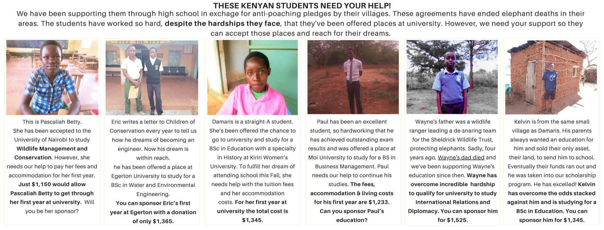 Now, these six students need YOUR support to be able to take up their places and earn their degrees. You can give them this life-changing opportunity for as little as $96 per month.